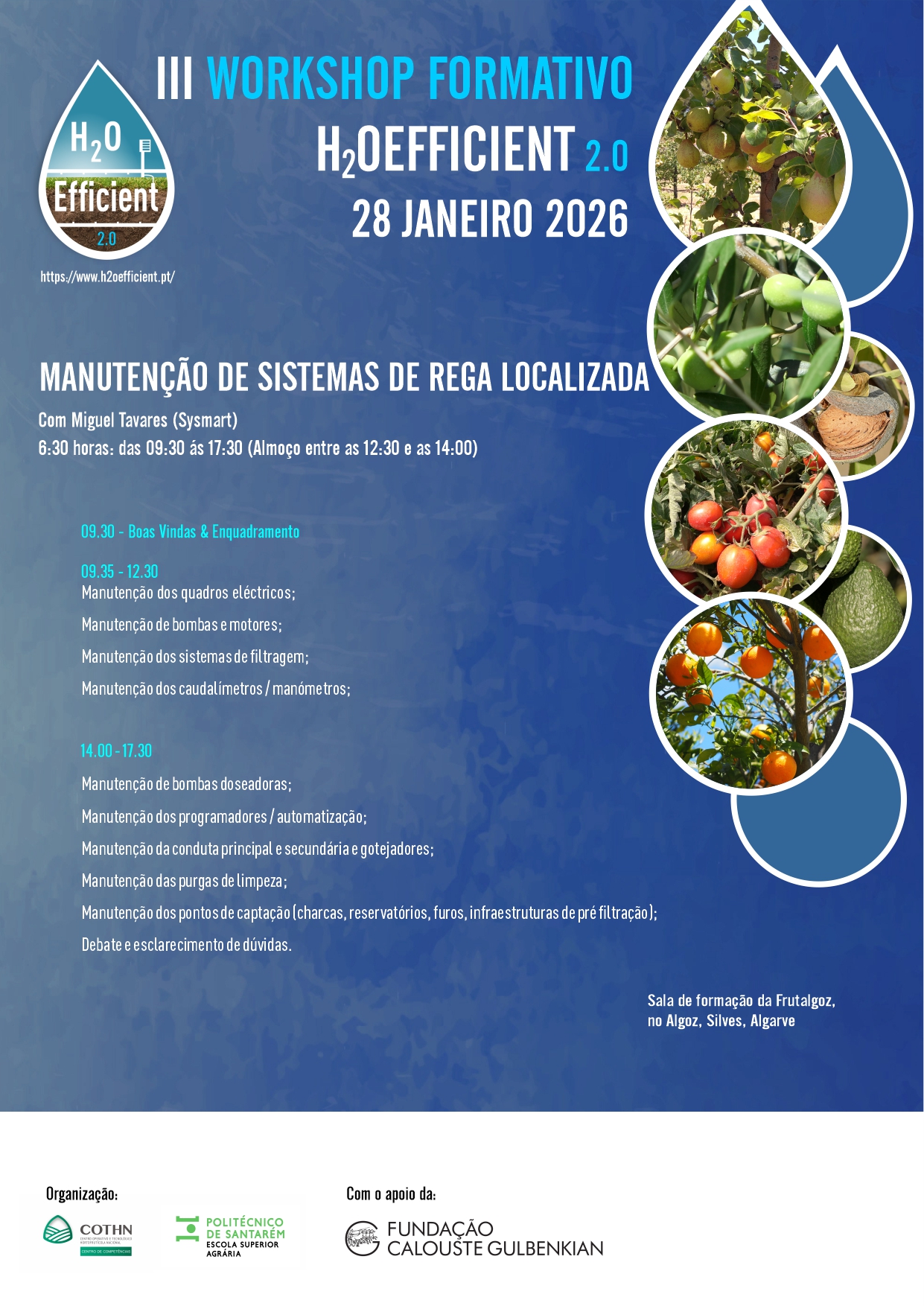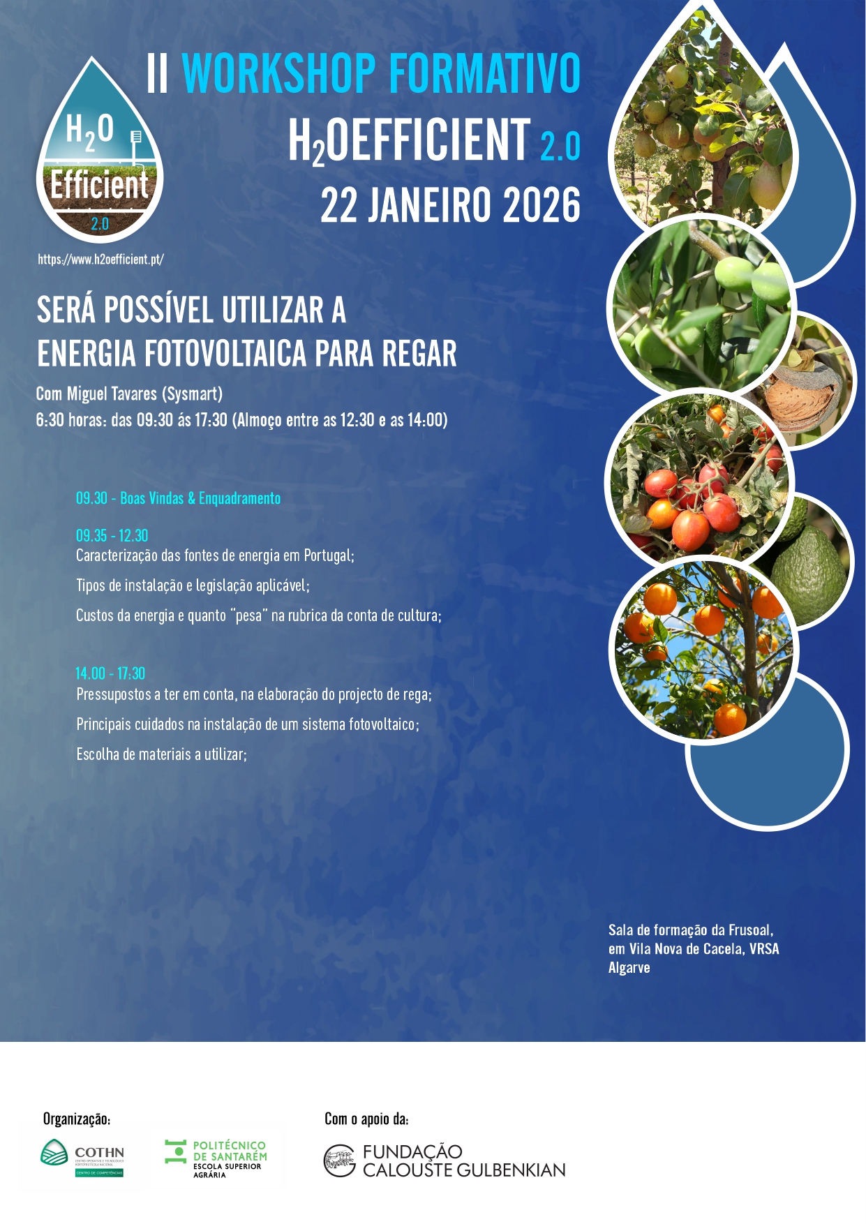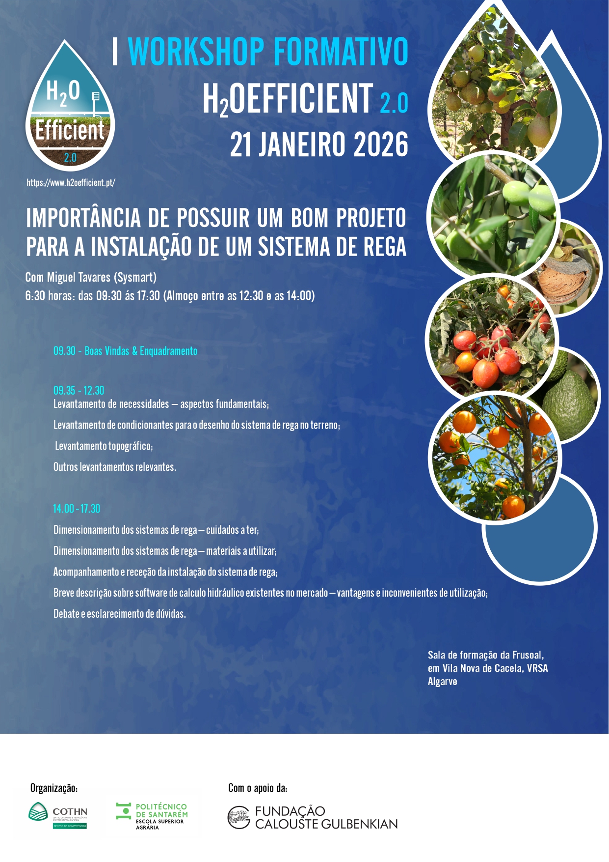 No âmbito do Projeto H2OEfficient "Eficiência do uso da água na Agricultura", desenvolvido pelo consórcio liderado pelo COTHN-CC e pelo IPS-ESA, com o apoio da Fundação Calouste Gulbenkian, decorreu um MOOC (Massive Open Online Course) gratuito, entre os dias 28 de janeiro e 6 de fevereiro de 2025, com cerca de 4/5 horas de duração, dividido por 4 módulos, com sessões assíncronas e síncronas.