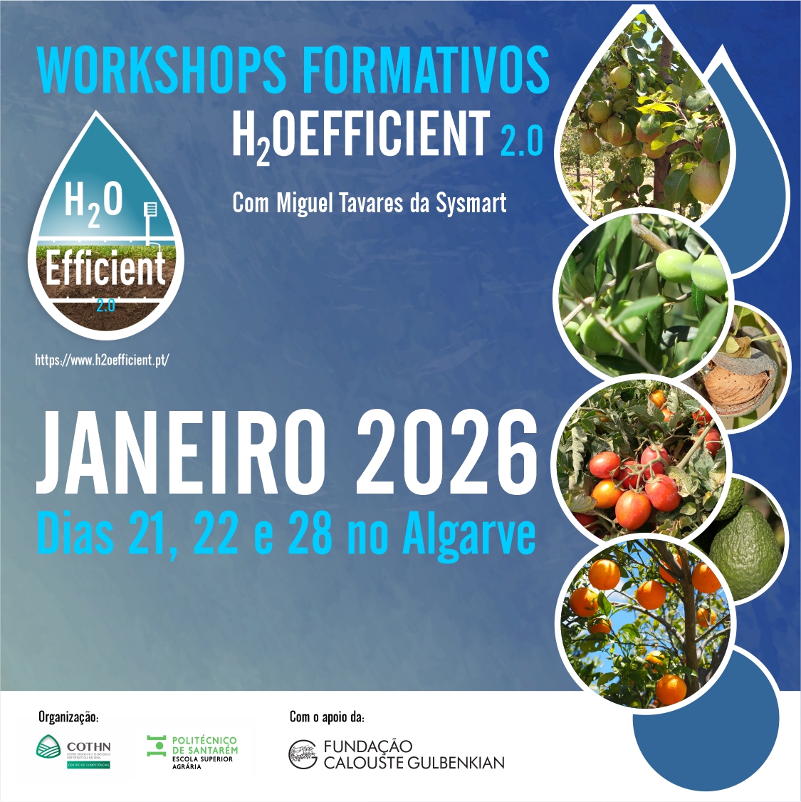 No âmbito do Projeto H2OEfficient "Eficiência do uso da água na Agricultura", desenvolvido pelo consórcio liderado pelo COTHN-CC e pelo IPS-ESA, com o apoio da Fundação Calouste Gulbenkian, decorreu um MOOC (Massive Open Online Course) gratuito, entre os dias 28 de janeiro e 6 de fevereiro de 2025, com cerca de 4/5 horas de duração, dividido por 4 módulos, com sessões assíncronas e síncronas.