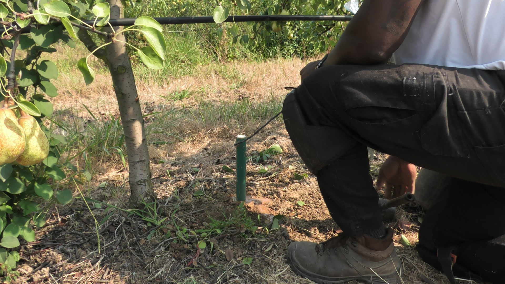 Instalação do sistema de rega enterrada num pomar de macieiras, a 26 de abril de 2023.